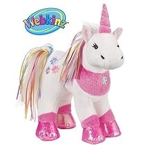 The Ribbon Unicorn is white with a pink horn pink hooves and pink around her neck with an aqua flower embroidered on her chest and there are 3 different colored flowers embroidered on her side. There are multi-colored ribbons flowing out of her mane and tail and she has pretty blue eyes!